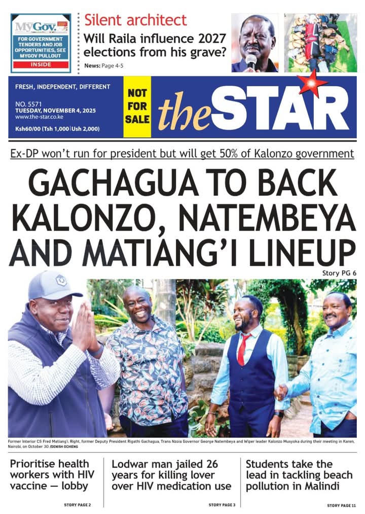 According to the paper, former Deputy President Rigathi Gachagua has opted out of the 2027 presidential race and will instead receive half of the proposed government under a Kalonzo Musyoka-led administration. The report suggests that Gachagua is backing a formidable alliance featuring Kalonzo, Trans Nzoia Governor George Natembeya, and former Interior Cabinet Secretary Dr. Fred Matiang’i. The front page teases the full story on page 6, signaling an emerging coalition that could reshape Kenya’s political landscape ahead of the next general election.
