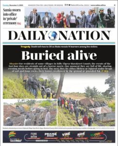 The paper reports a devastating tragedy in Elgeyo-Marakwet County, where landslides have claimed at least 30 lives, including 14 schoolchildren. Entire villages have been buried under mud and rocks following days of relentless rainfall. The Nation vividly recounts the horror faced by residents — from peaceful family dinners to sudden destruction and death — describing the scene as “straight out of a horror movie.” The heartbreaking story of loss and rescue efforts is detailed on page 28.
